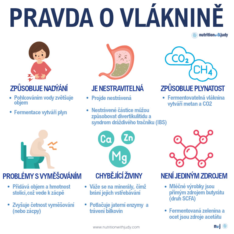 Jedna studie zjistila, že vyloučení vlákniny pomáhá při zácpě. Vláknina není stravitelná a musí být vyloučena stolicí. Kniha Fiber Menace podrobně popisuje, jak vysoký obsah vlákniny v syrových rostlinných potravinách, jako je ovoce a zelenina, způsobuje nadýmání, žaludeční křeče a plynatost. Vláknina může také vyvolat příznaky u osob s IBD, včetně IBS (syndrom dráždivého tračníku, pozn. překladatele), a zhoršit stavy, jako je SIBO. Pokud osoby s onemocněním střev a zhoršeným zdravím střev netolerují vlákninu, a dokonce i zdraví jedinci běžně trpí nadýmáním a gastrointestinálními potížemi, jak přesně může vláknina pomoci zdraví střev?